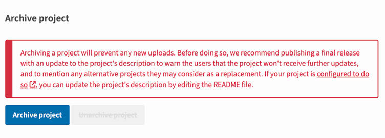 Если работа над проектом возобновится, архив можно снять в любой момент. Для реализации функции используется модель LifecycleStatus, изначально разработанная для карантина проектов. В системе предусмотрена возможность переключения между различными статусами, а PyPI планирует в будущем добавить дополнительные метки вроде «deprecated» (устаревший), «feature-complete» (полнофункциональный) и «unmaintained» (неподдерживаемый). Это поможет пользователям быстрее ориентироваться в состоянии зависимостей.