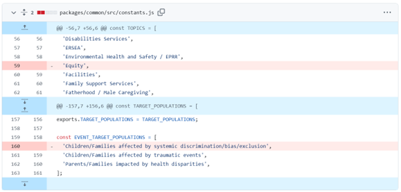 Разработчики из компании Ad Hoc LLC, подрядчика HHS, изменили код базы данных, исключив упоминания «справедливости» из всех выпадающих списков, фильтров и целей программы. В комментариях кода просят коллег проверить, не остались ли ещё где-то «запрещённые слова».