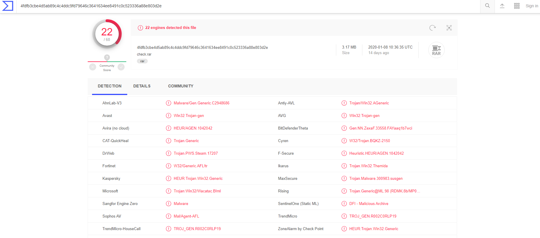 VT: https://www.virustotal.com/#/file/8...5c97bb01252091d1a062b3b7f95ad8bf53d/detection