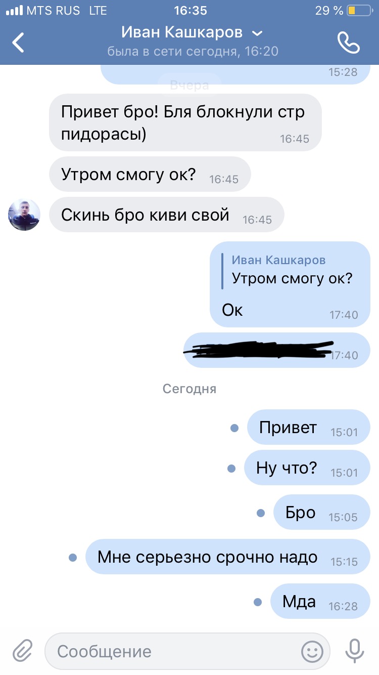 История такова, что 10 января он попросил ему занять копейку «на сиги». Мол, трудная ситуация, помоги. Думаю, ну ладно, с кем не бывает, от 179р не обеднею. Скинул ему. Он сказал, что на следующий день отдаст, но так и не отдал. Я сам студент, и деньги мне даются нелегко, так что это еще одна причина, по которой я по-началу вежливо начал его просить вернуть долг (ну а с другой стороны, какого хрена я должен направо и налево раздавать деньги?). 14 января я ему написал и попросил вернуть долг, он сказал что сегодня утром закинет. В итоге полнейший игнор, для теста написал ему с левого акка, он сразу же прочитал и ответил, а как задал вопрос, почему не отвечаешь тому то, сразу игнор.