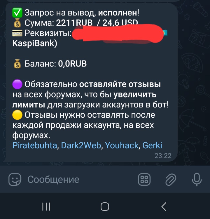 secure_sec Новорег 100 0 13 Авг 2024 6 Сен 2024 #1,010 Продал очередной аккаунт в данном боте,за хорошую цену,выплата пришла в течение 3 минут,спасибо! Вложения Screenshot_20240906_235737_Telegram.jpg 157.9 KB Скачано: 79 Screenshot_20240906_235805_Telegram.jpg 122.6 KB Скачано: 93