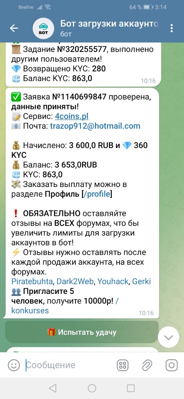 Verificator написал(а): Посмотреть вложение 17806 Посмотреть вложение 17807 Нажмите для раскрытия... Еще один мои продажа в боте!Спасибо боту за такой отличной заработок!Все супер!