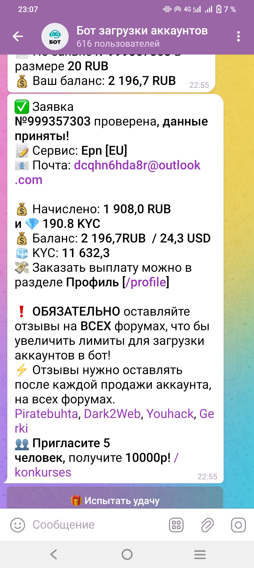 Verificator написал(а): Посмотреть вложение 17806 Посмотреть вложение 17807 Нажмите для раскрытия... Продаётся который уже аккаунт в данном боте,спасибо просто лучшие цены!👍👍👍