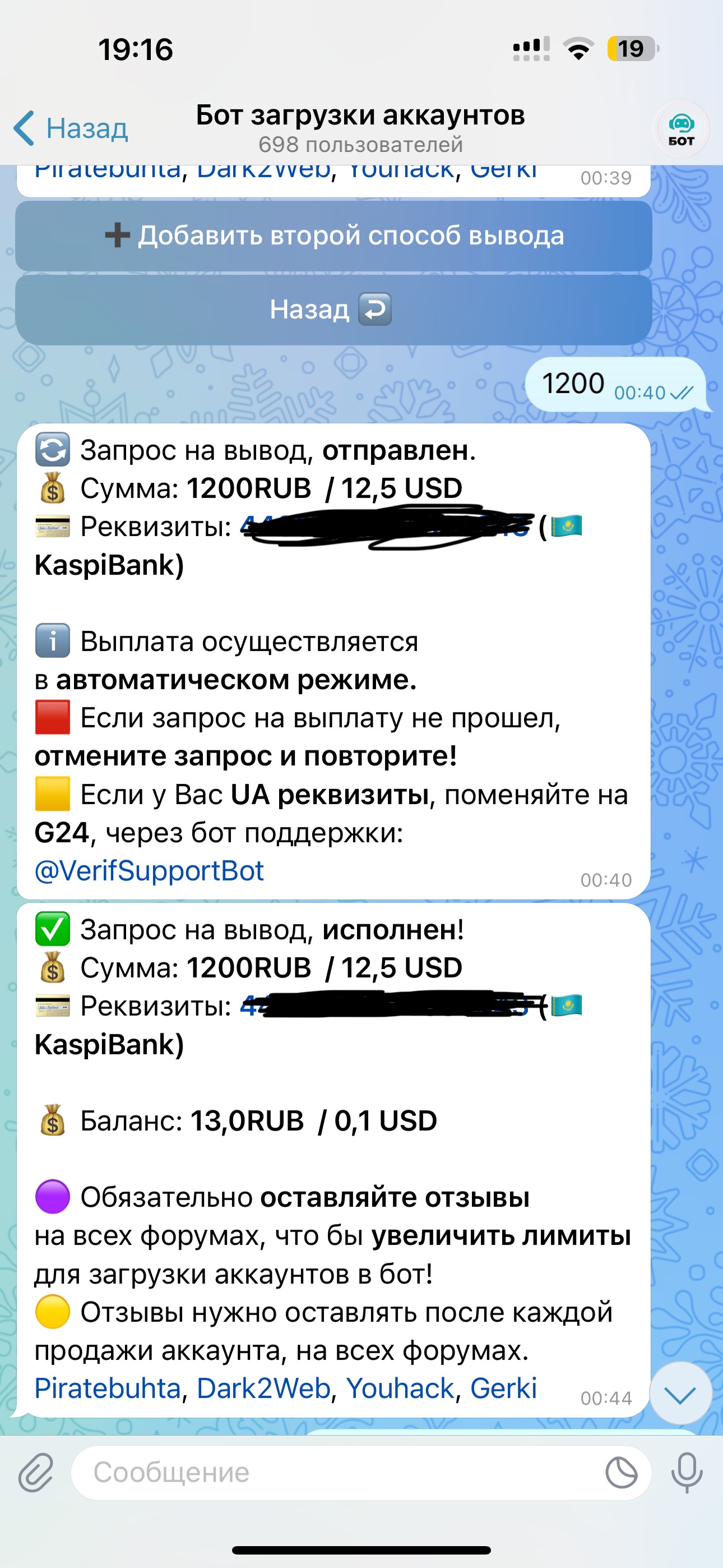 secure_sec Новорег 82 0 13 Авг 2024 21 Мар 2025 #1,445 Очередные 4 проданных аккаунта в боте и выплата моментальны,спасибо большое,просто лучшие. Вложения Screenshot_20250321_082903_Telegram.jpg 218.7 KB Скачано: 89 Screenshot_20250321_082920_Telegram.jpg 199.6 KB Скачано: 80 Screenshot_20250321_082941_Telegram.jpg 101.1 KB Скачано: 76 Screenshot_20250321_083015_Telegram.jpg 171.5 KB Скачано: 80 Screenshot_20250321_083030_Telegram.jpg 223.7 KB Скачано: 83 Screenshot_20250321_083040_Telegram.jpg 100.6 KB Скачано: 82