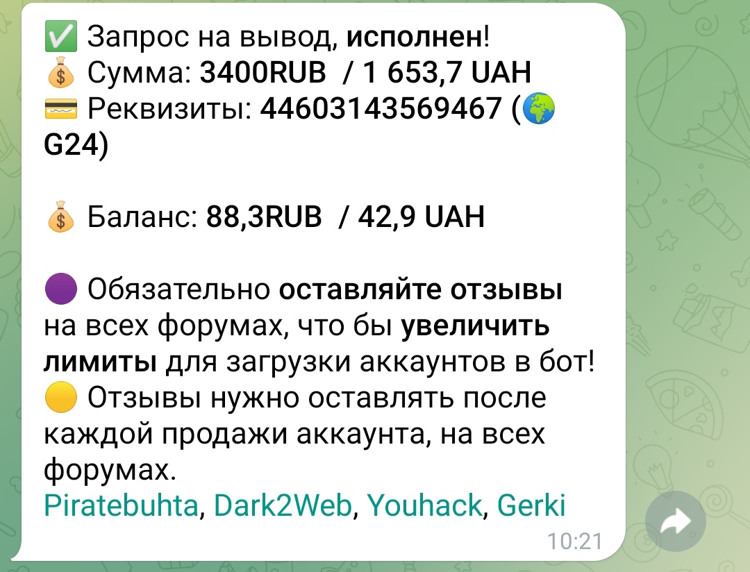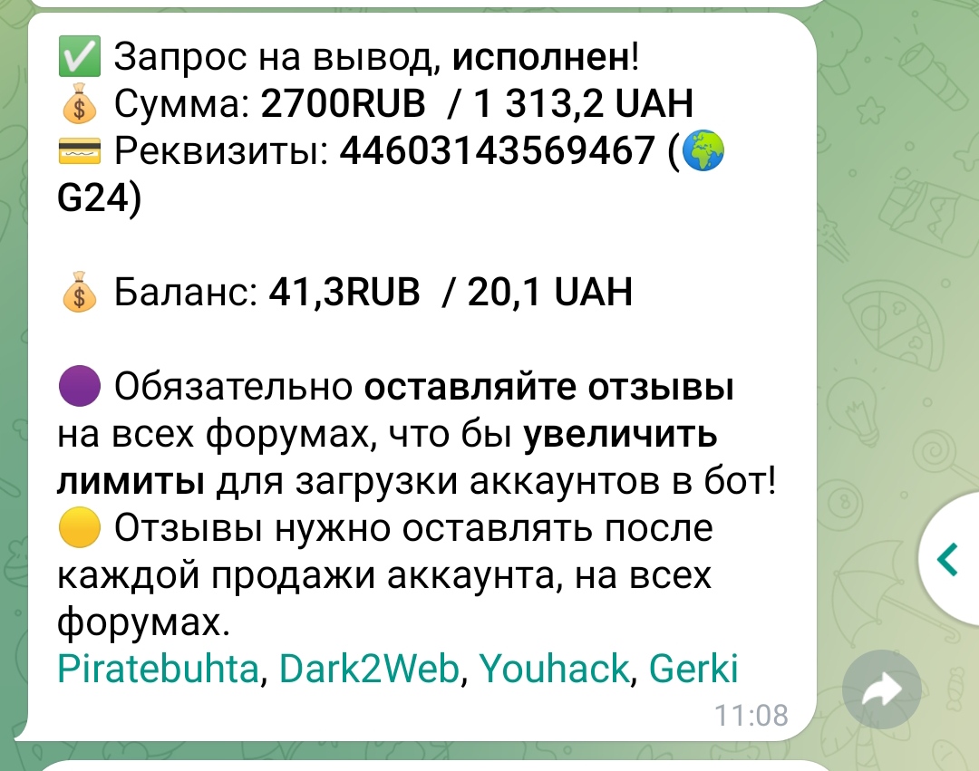 secure_sec Новорег 84 0 13 Авг 2024 1 Авг 2025 #1,615 Продал ещё аккаунтов в боте,спасибо большое,как всегда всегда все отлично. Вложения Screenshot_20250801_130356_Telegram.jpg 164.4 KB Скачано: 112 Screenshot_20250801_130524_Telegram.jpg 161.4 KB Скачано: 113 Screenshot_20250801_130557_Telegram.jpg 162.8 KB Скачано: 113 Screenshot_20250801_130504_Telegram.jpg 103.7 KB Скачано: 111 Screenshot_20250801_130613_Telegram.jpg 103.9 KB Скачано: 118