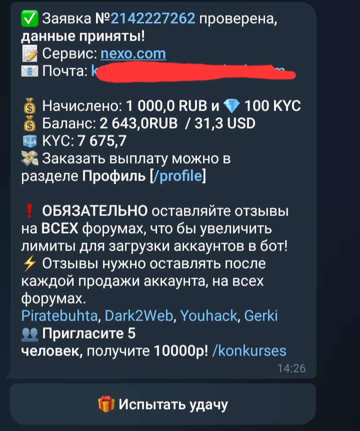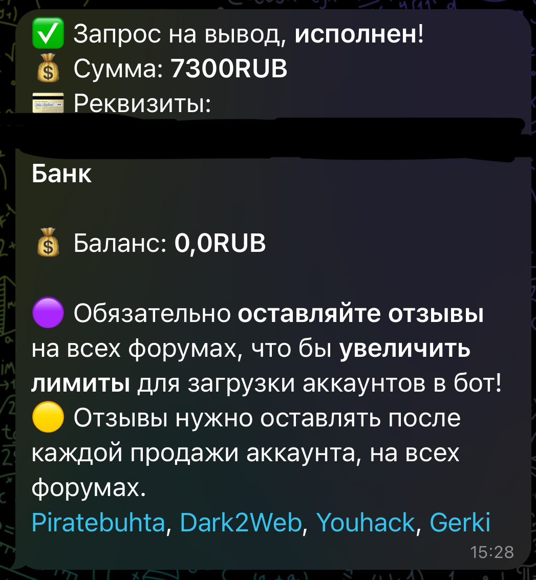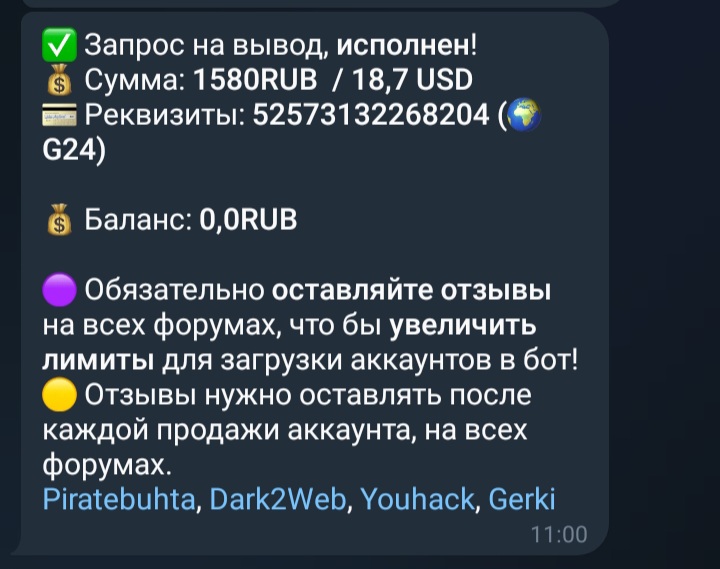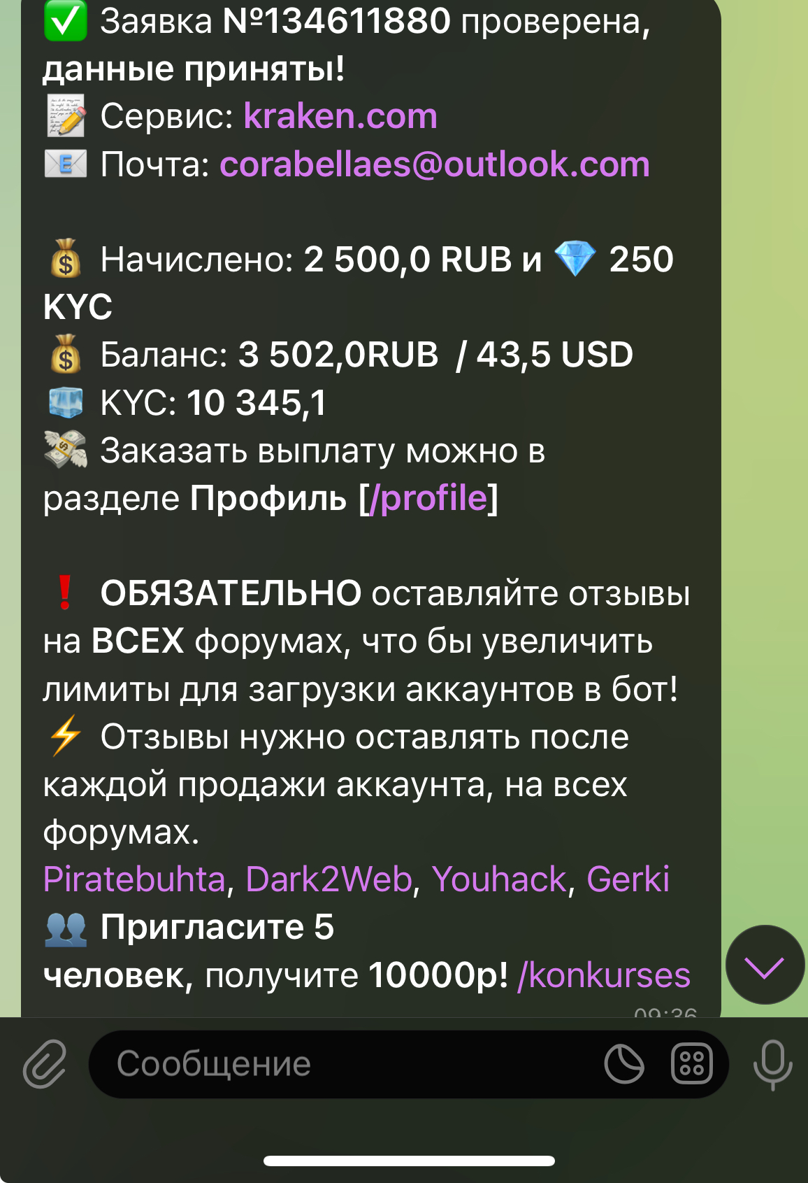 secure_sec Новорег 84 0 13 Авг 2024 29 Авг 2025 #1,658 Продал ещё аккаунтов в боте,спасибо большое за выплату и надбавки. Вложения Screenshot_20250829_050457_Telegram.jpg 195.5 KB Скачано: 57 Screenshot_20250829_050525_Telegram.jpg 187 KB Скачано: 56 Screenshot_20250829_050540_Telegram.jpg 157.7 KB Скачано: 52 Screenshot_20250829_050513_Telegram.jpg 101.8 KB Скачано: 58 Screenshot_20250829_050552_Telegram.jpg 104.5 KB Скачано: 55