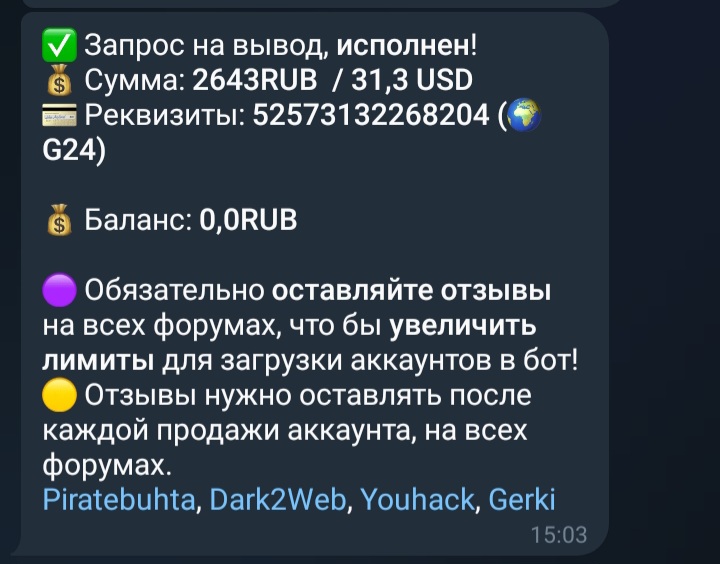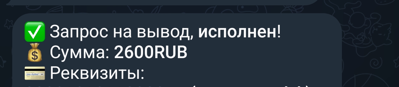 Verificator написал(а): Посмотреть вложение 17806 Посмотреть вложение 17807 Нажмите для раскрытия... Спасибо боту за предоставленный заработок! Вывод быстрый как всегда