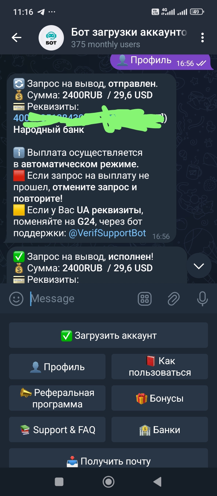 KOTA4I Новорег 9 0 11 Фев 2021 2 Ноя 2025 #1,827 В очередной раз продал пачку аккаунтов. Всё ровно, выплаты быстрые, поддержка всегда поможет. Рекомендую! Вложения Screenshot_4.png 8.7 KB Скачано: 20 Screenshot_3.png 18.5 KB Скачано: 21 Screenshot_2.png 19.4 KB Скачано: 23 Screenshot_1.png 17.6 KB Скачано: 23