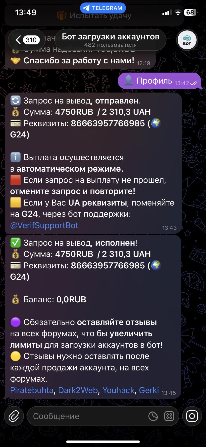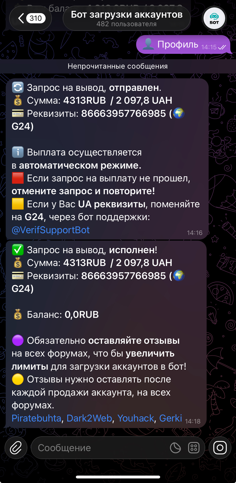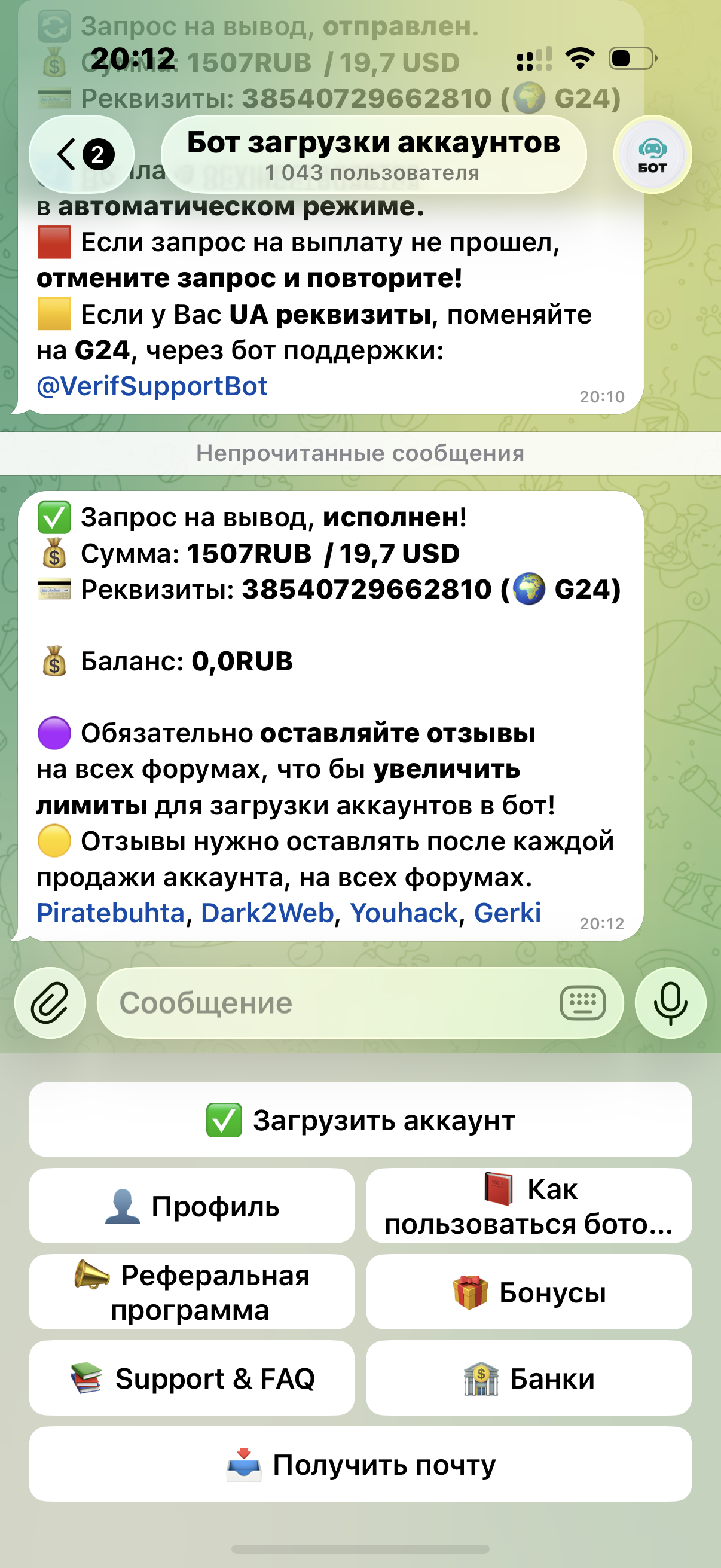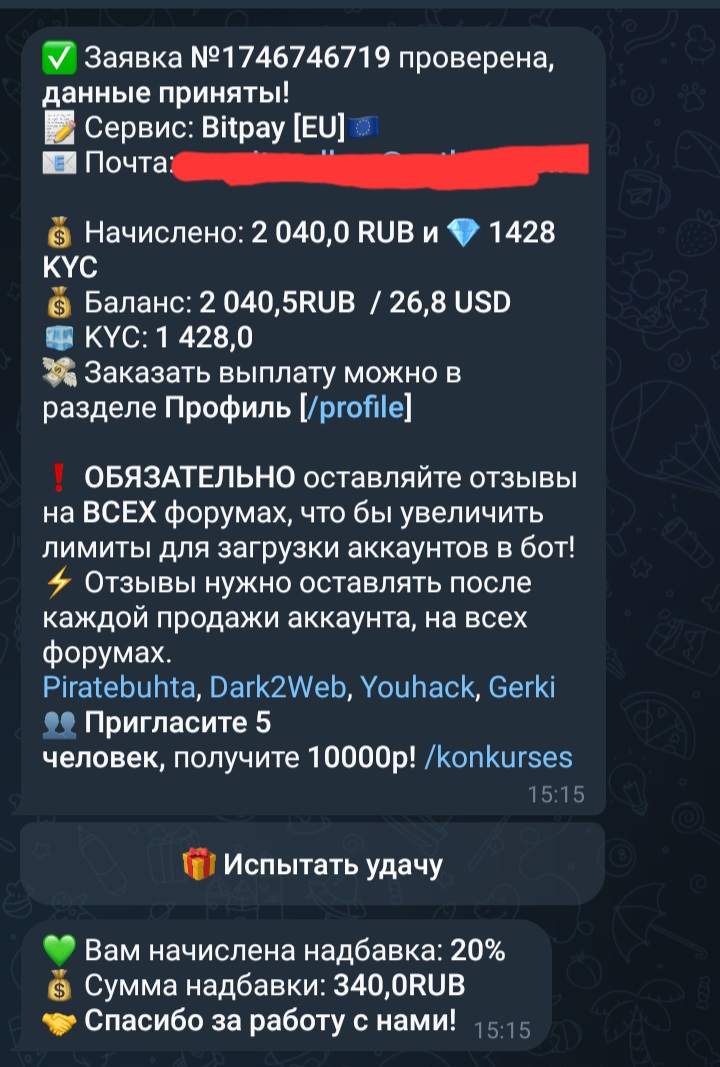 secure_sec Новорег 87 0 13 Авг 2024 Понедельник в 02:09 #2,022 Рекомендую данного бота,продал аккаунт деньги получил в карман. Вложения Screenshot_20260130_151544_Telegram.jpg 206.9 KB Скачано: 4 Screenshot_20260130_171023_Telegram.jpg 113.8 KB Скачано: 3