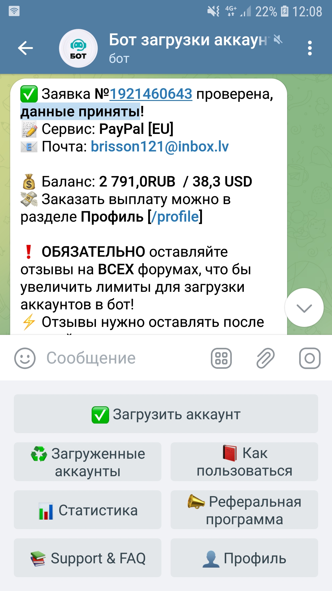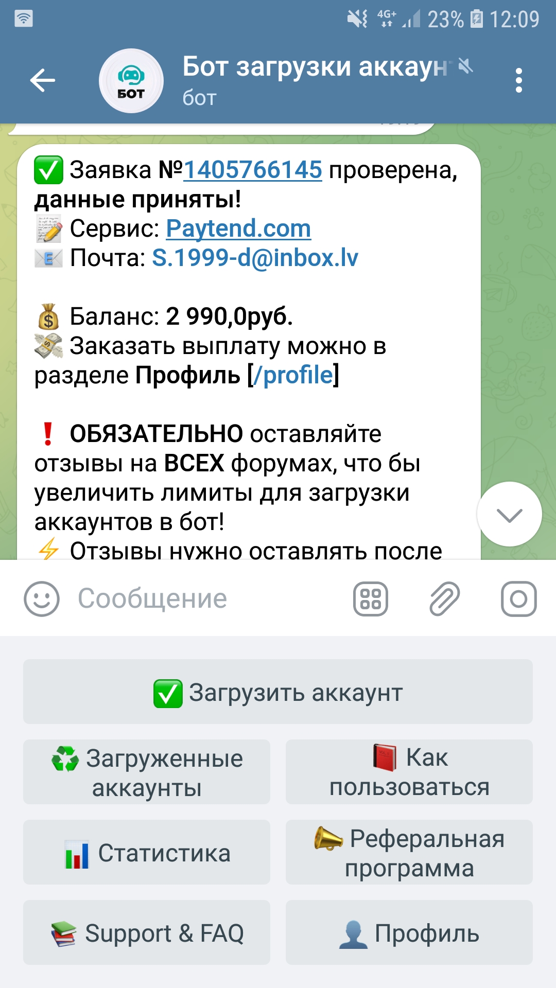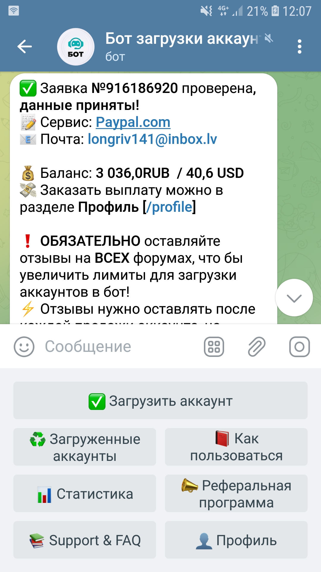 Оставляю 1 отзыв за 4выплаты. Спасибо за сотрудничество. Бот выплачивает . Рекомендую к сотрудничеству. Ничего сложного в загрузке аккаунтов нет. Служба поддержки всегда подскажет и поможет. Спасибо за возможность заработать