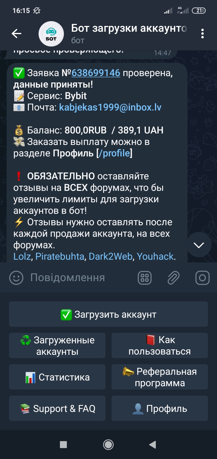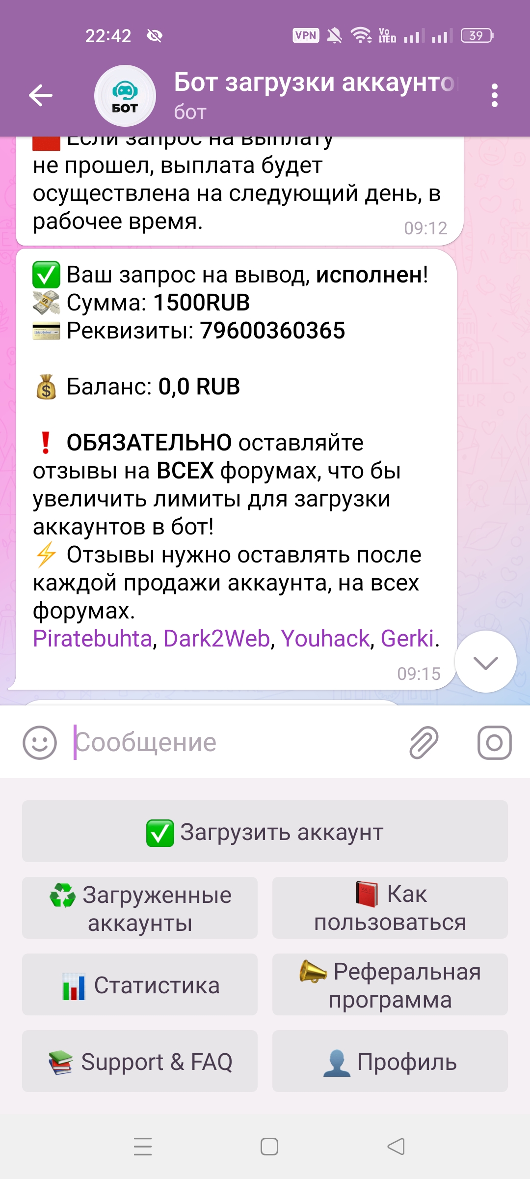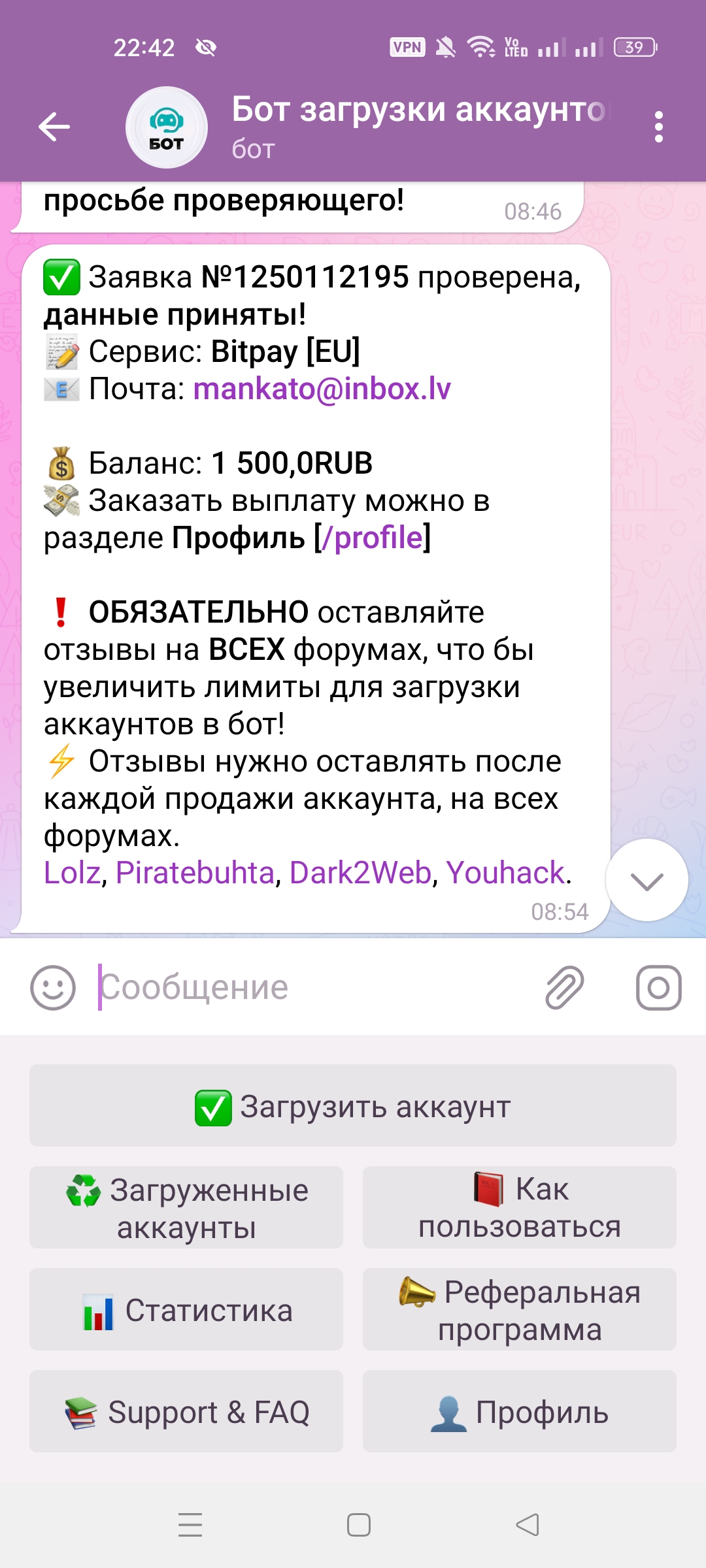 Оставляю 1 отзыв за 4выплаты. Спасибо за сотрудничество. Бот выплачивает . Рекомендую к сотрудничеству. Ничего сложного в загрузке аккаунтов нет. Служба поддержки всегда подскажет и поможет. Спасибо за возможность заработать