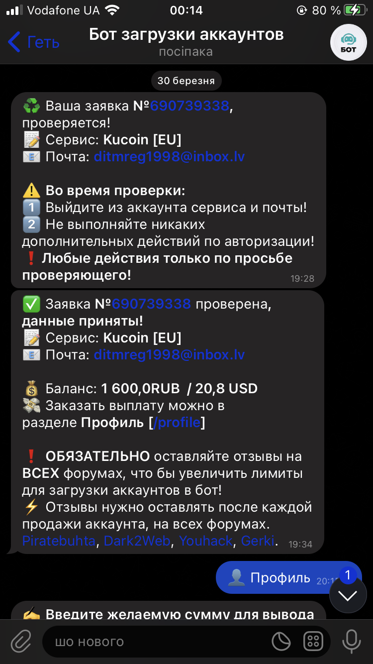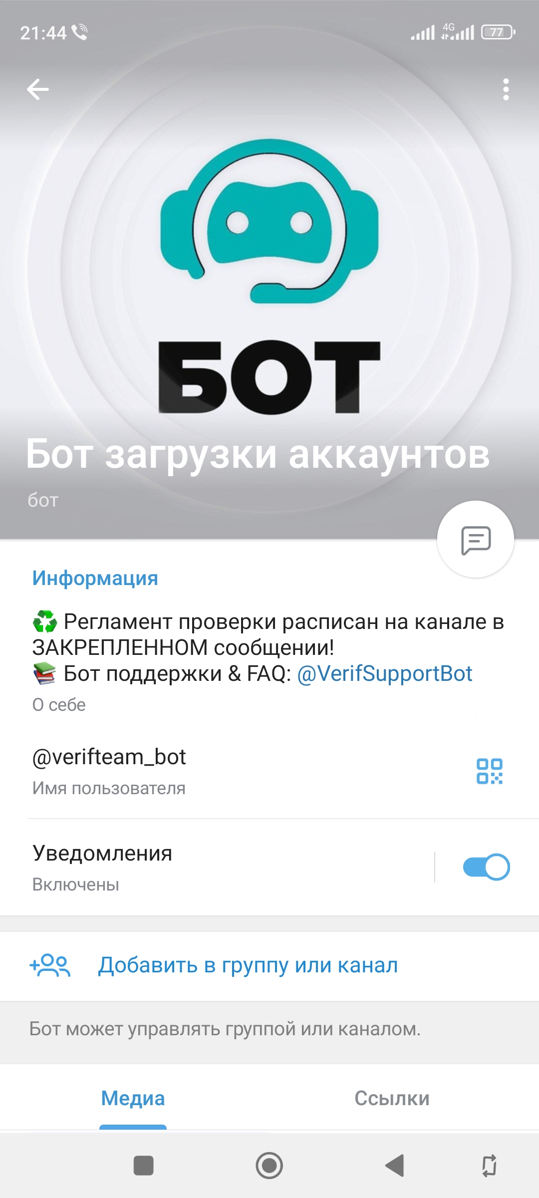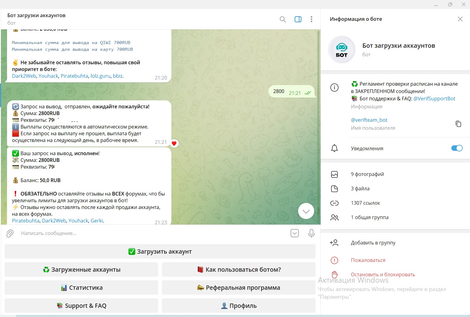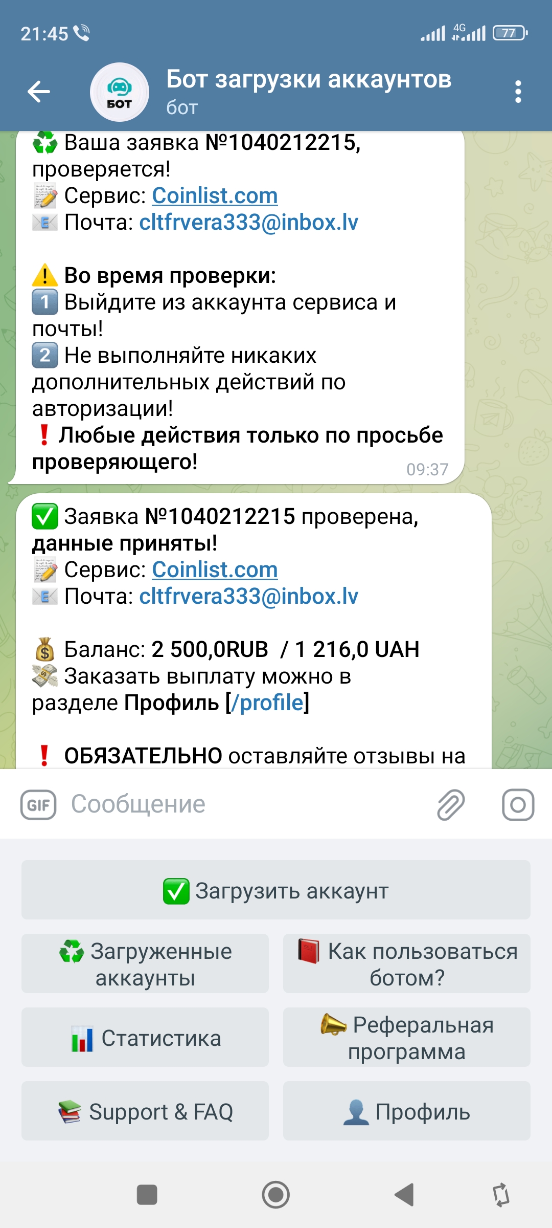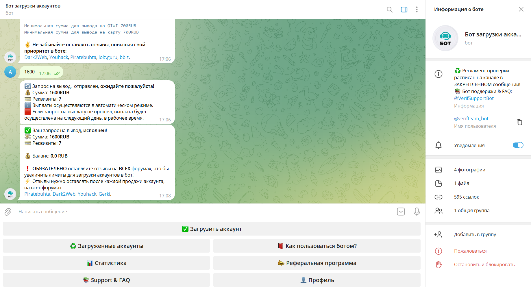 Verificator написал(а): Посмотреть вложение 17806 Посмотреть вложение 17807 Нажмите для раскрытия... Спасибо большое! Все честно получила оплату и очень удобно работать с вами))) Бот загрузки аккаунтов ♻️ Регламент проверки расписан на канале в ЗАКРЕПЛЕННОМ сообщении! 📚 Бот поддержки & FAQ: @VerifSupportBot t.me