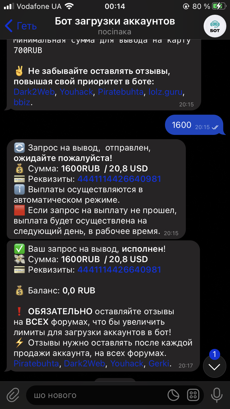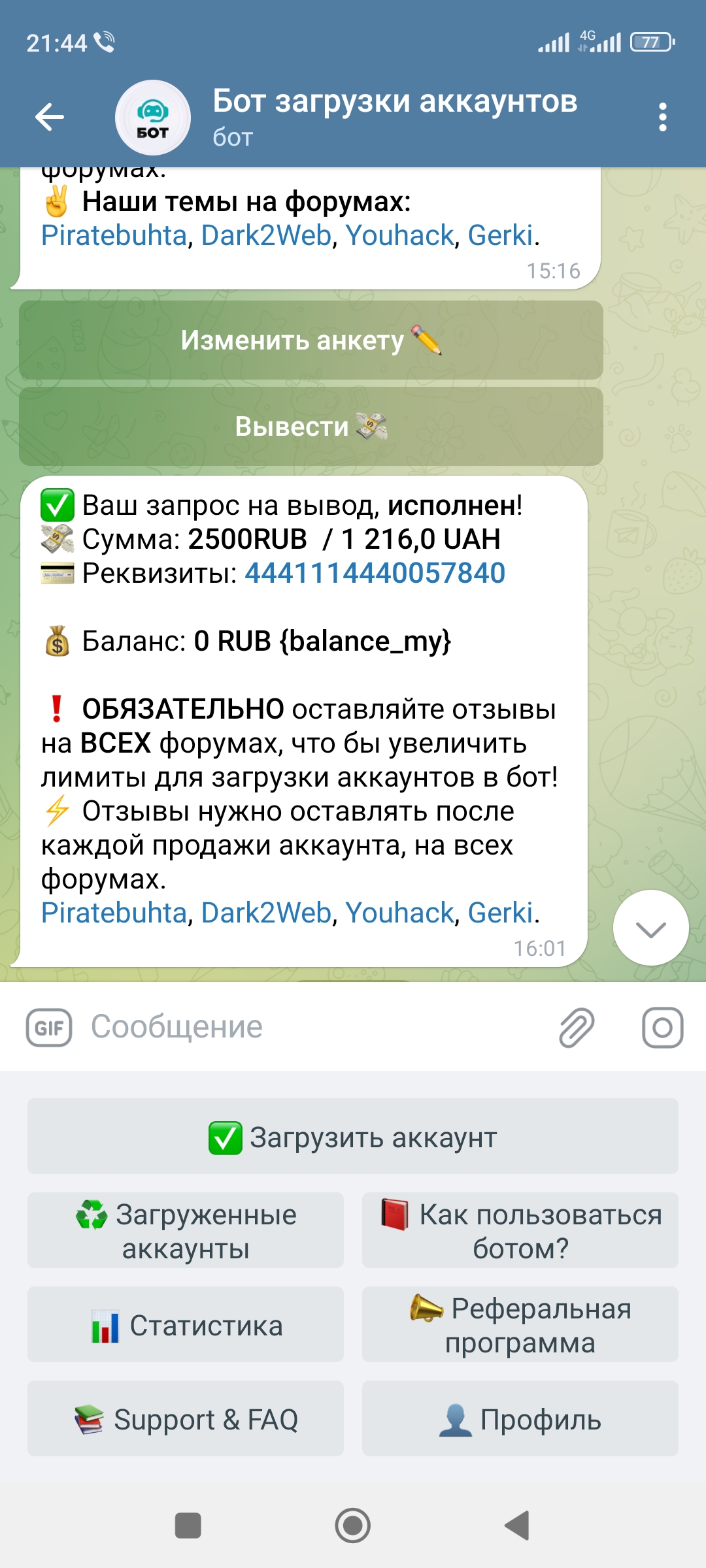 Спасибо боту за очередную выплату. Работаю давно и никогда не имел проблемы. Всегда все на высшем уровне в боте! топ!