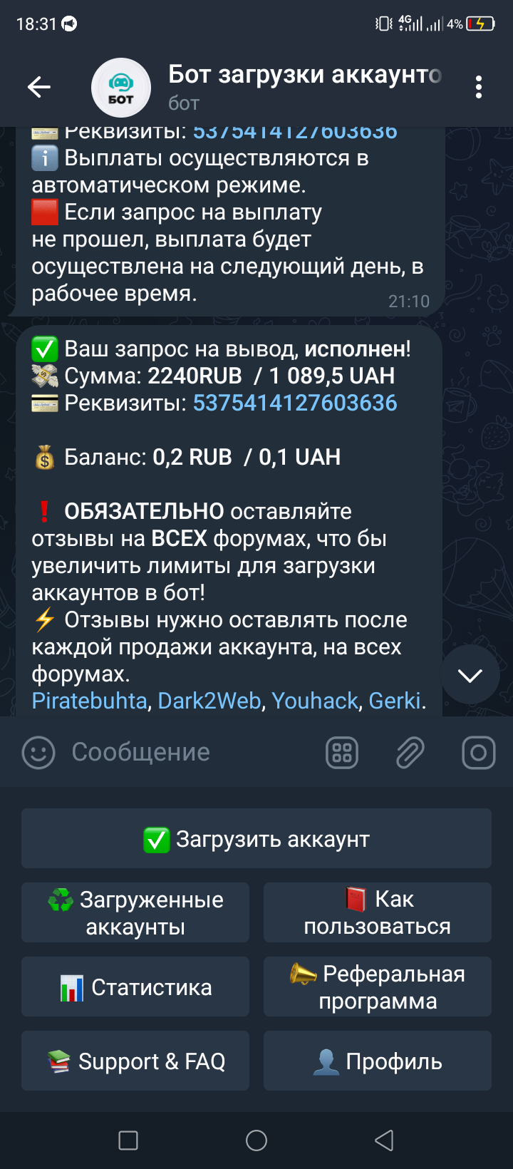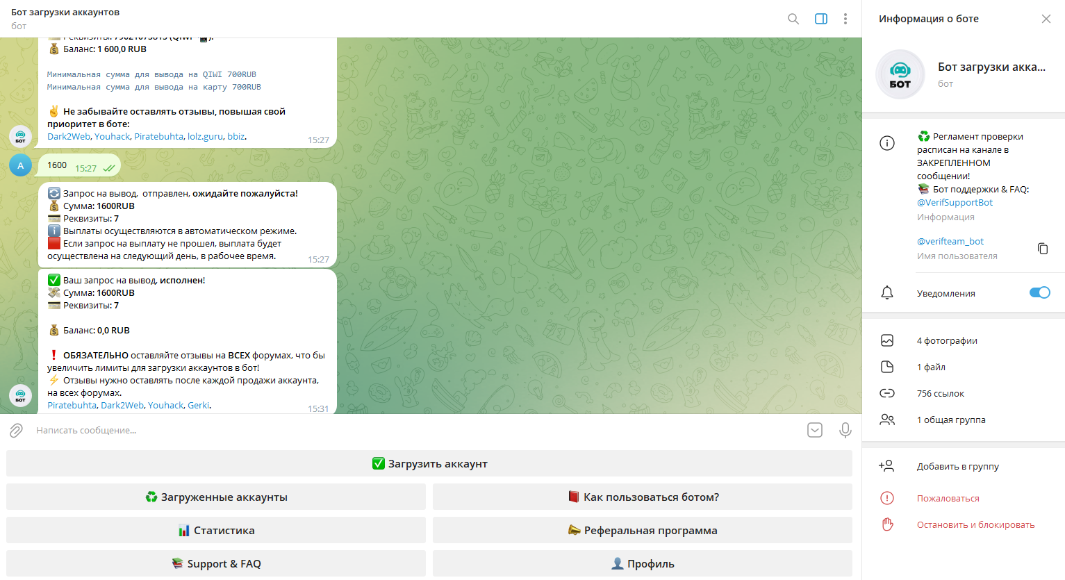 Verificator написал(а): Посмотреть вложение 17806 Посмотреть вложение 17807 Нажмите для раскрытия... Я работаю с данным сервисом больше года, и очень доволен!!! Очень грамотно продуман весь процесс. Хорошая отзывчивая поддержка. Всем рекомендую!))) Бот загрузки аккаунтов ♻️ Регламент проверки расписан на канале в ЗАКРЕПЛЕННОМ сообщении! 📚 Бот поддержки & FAQ: @VerifSupportBot t.me