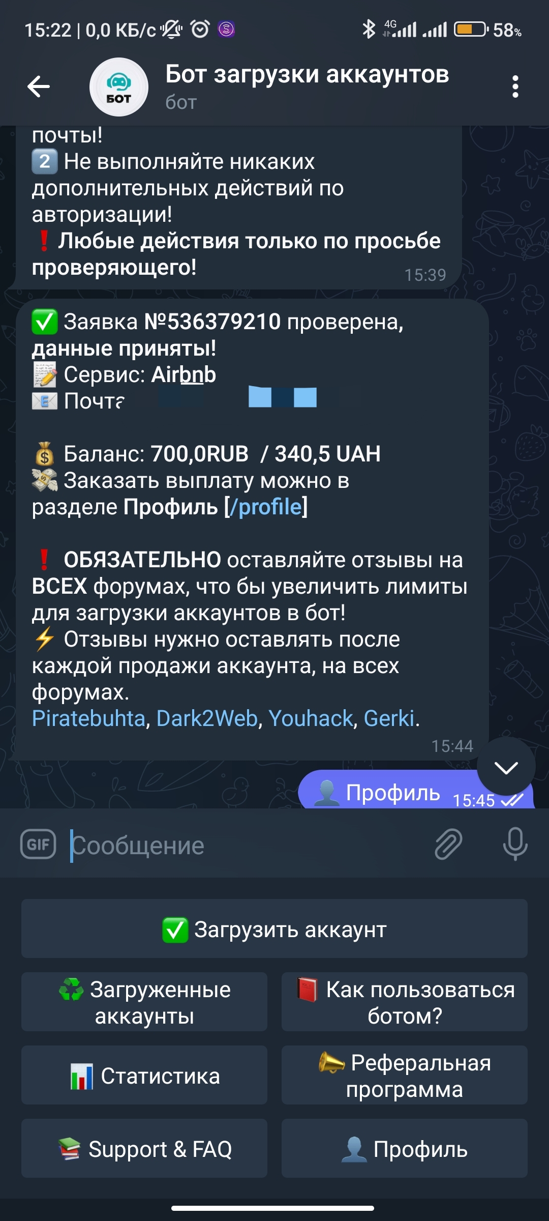 Taufyn4ik Новорег 3 0 22 Апр 2023 22 Апр 2023 #264 Verificator написал(а): Посмотреть вложение 17806 Посмотреть вложение 17807 Нажмите для раскрытия... Я работаю с данным сервисом больше года, и очень доволен!!! Очень грамотно продуман весь процесс. Хорошая отзывчивая поддержка. Всем рекомендую!))) Бот загрузки аккаунтов ♻️ Регламент проверки расписан на канале в ЗАКРЕПЛЕННОМ сообщении! 📚 Бот поддержки & FAQ: @VerifSupportBot t.me