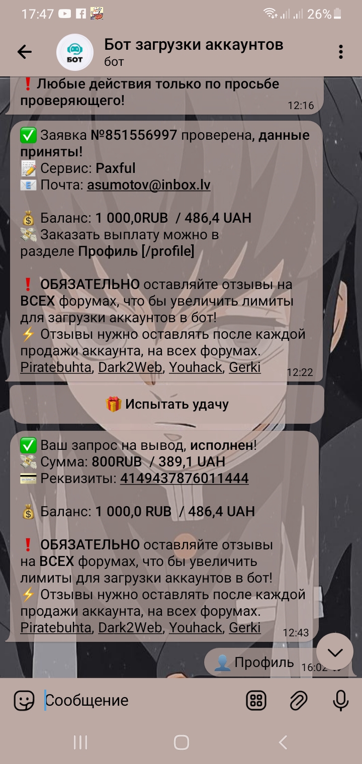 A ArturSym Новорег 5 0 1 Авг 2023 3 Авг 2023 #439 все очень быстро без задержек, лучшый бот... Вложения Screenshot_20230803-174703_Telegram.jpg 524.7 KB Скачано: 111 Screenshot_20230803-174803_Privat24.jpg 57.6 KB Скачано: 113