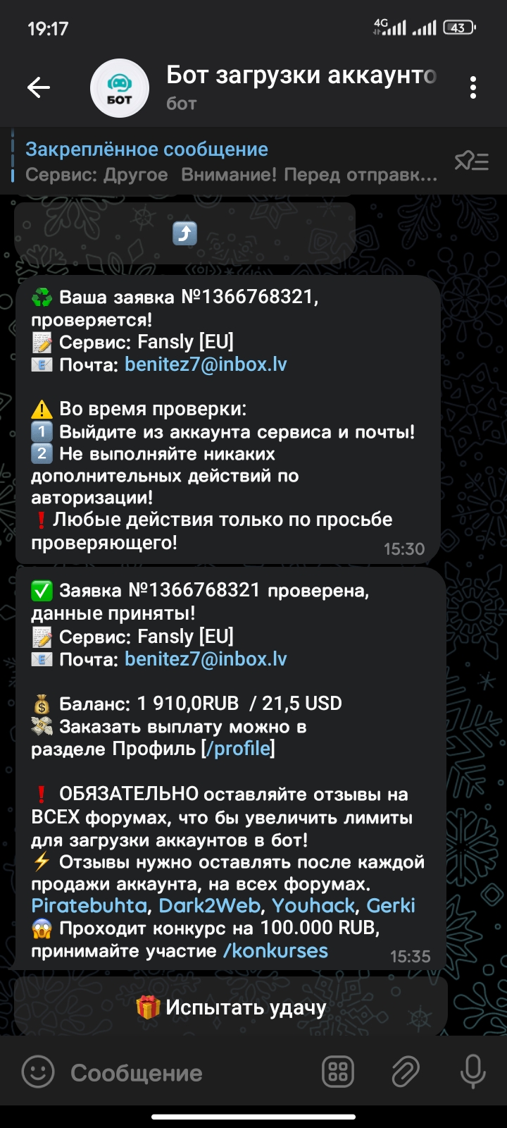 очередная продажа аккаунта, и деньги тоже поступили быстро на кошолек 🥳🥳 Verificator написал(а): Посмотреть вложение 17806 Посмотреть вложение 17807 Нажмите для раскрытия...