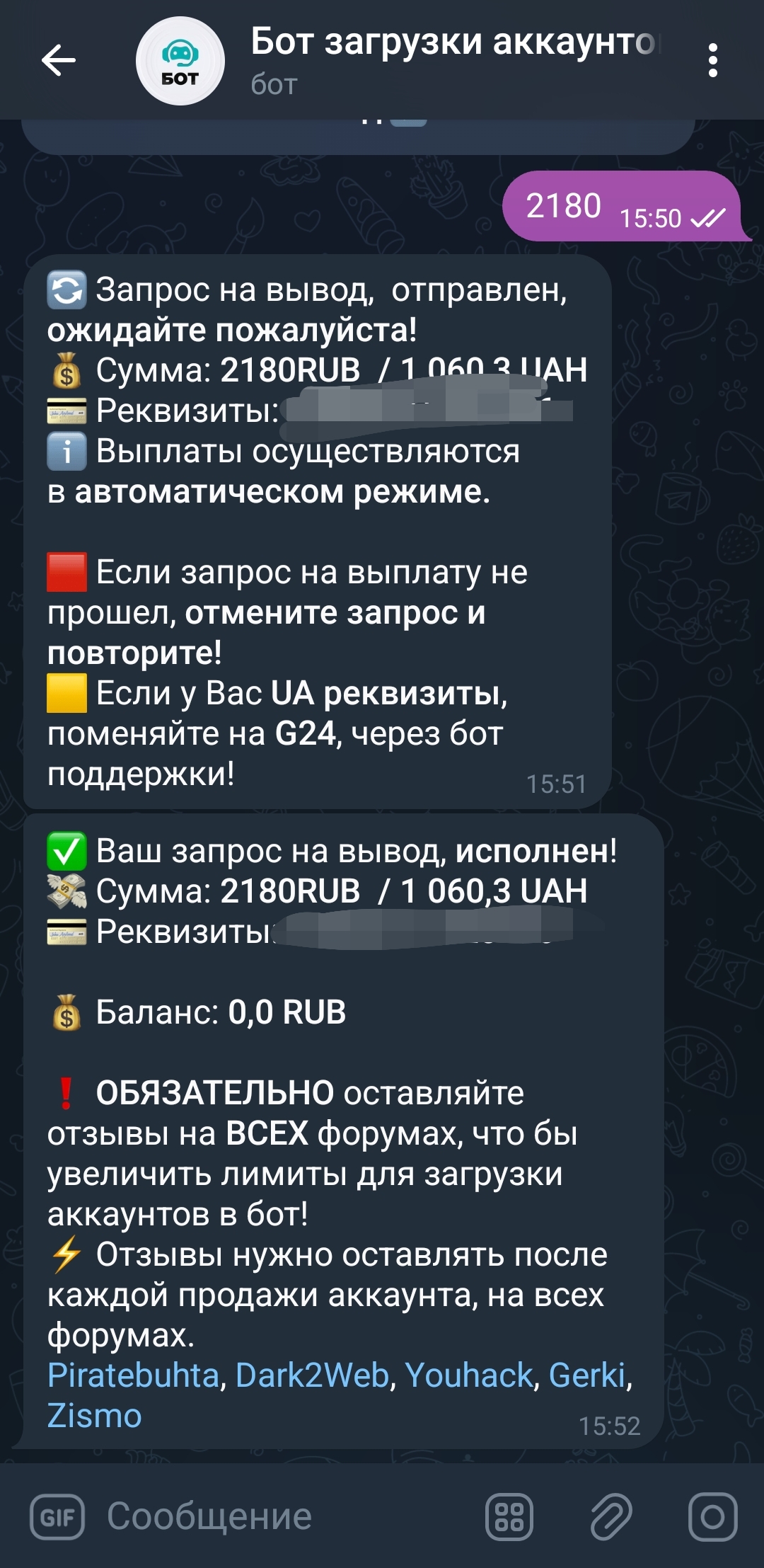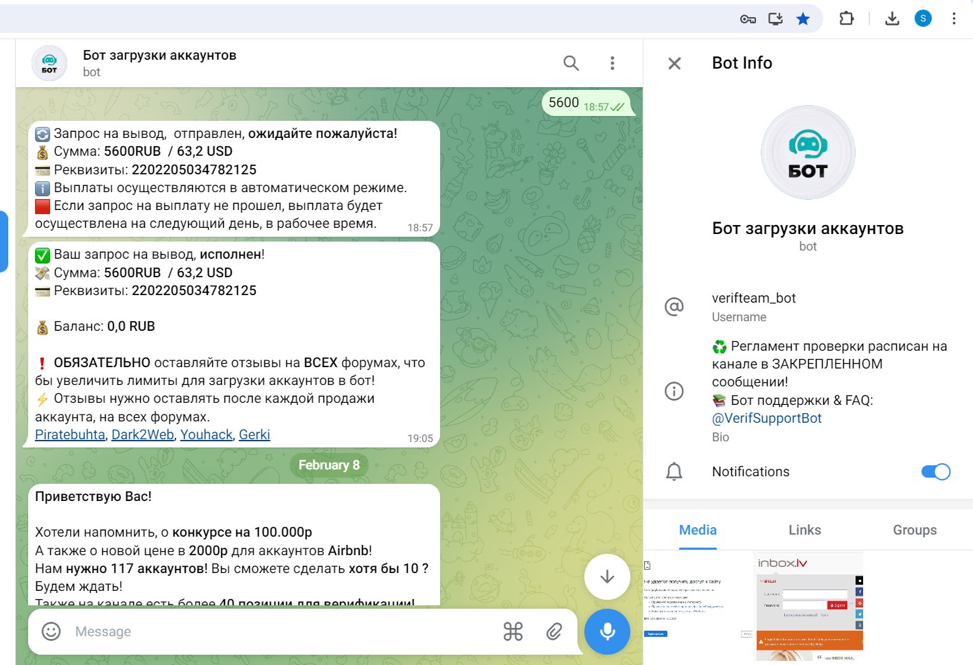 Обожаю работать с ботом!!! Быстро проверяют, быстро выплачивают, и чем ботьше проданных аккаунтов в бот тем больше дополнительная надбавка за аккаунты!!! Спасибо большое, продолжаем работать!)