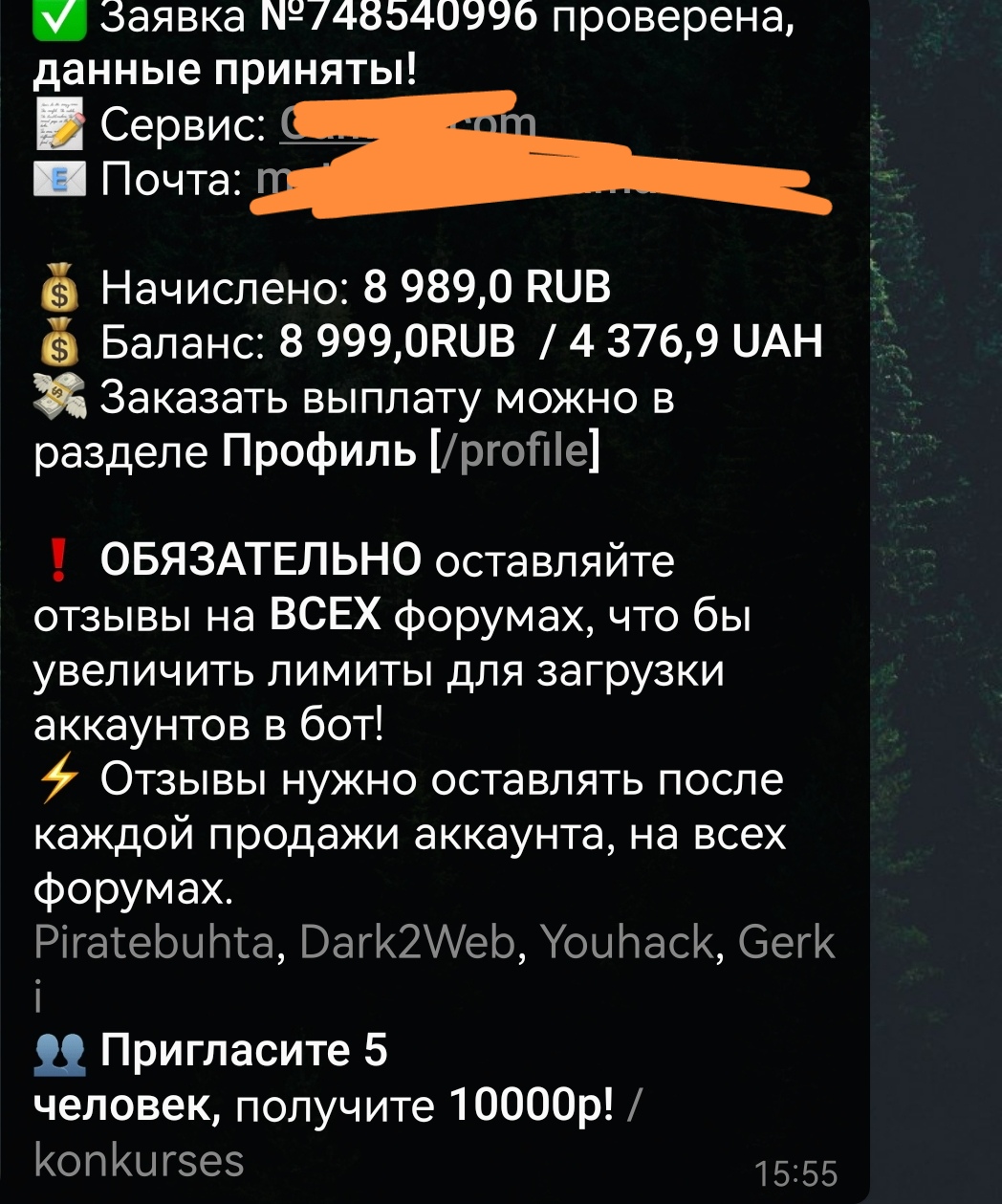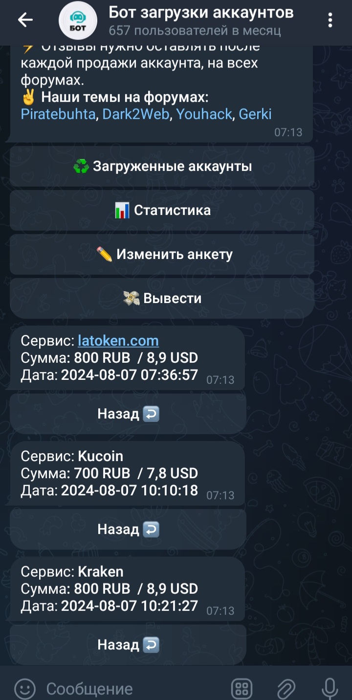 secure_sec Новорег 101 0 13 Авг 2024 15 Авг 2024 #987 Продал в боте 3 вот таких аккаунта все как всегда на высоте,выплату получил в течение 5 минут топ.Будем дальше работать! Вложения Screenshot_20240815_071424_Telegram.jpg 222.6 KB Скачано: 104 Screenshot_20240815_071625_Chrome.jpg 37.4 KB Скачано: 105
