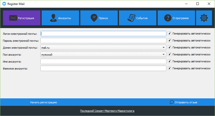 - имеется автоматический генератор баз почт на продажу, менеджмент аккаунтов и прокси (открывается через меню на правой кнопке мыши)