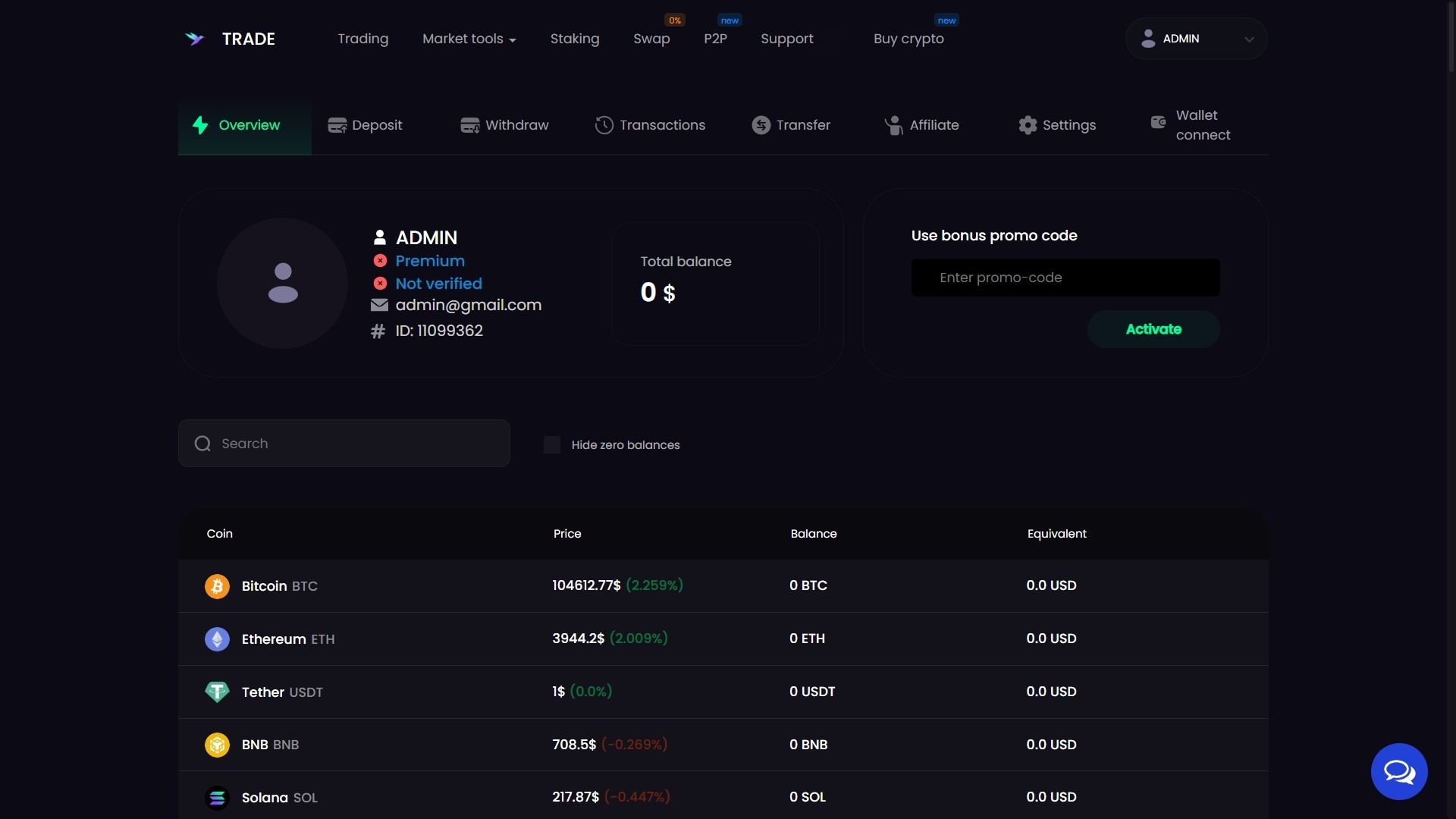 - Promocodes - Список всех промокодов биржи и создание новых;