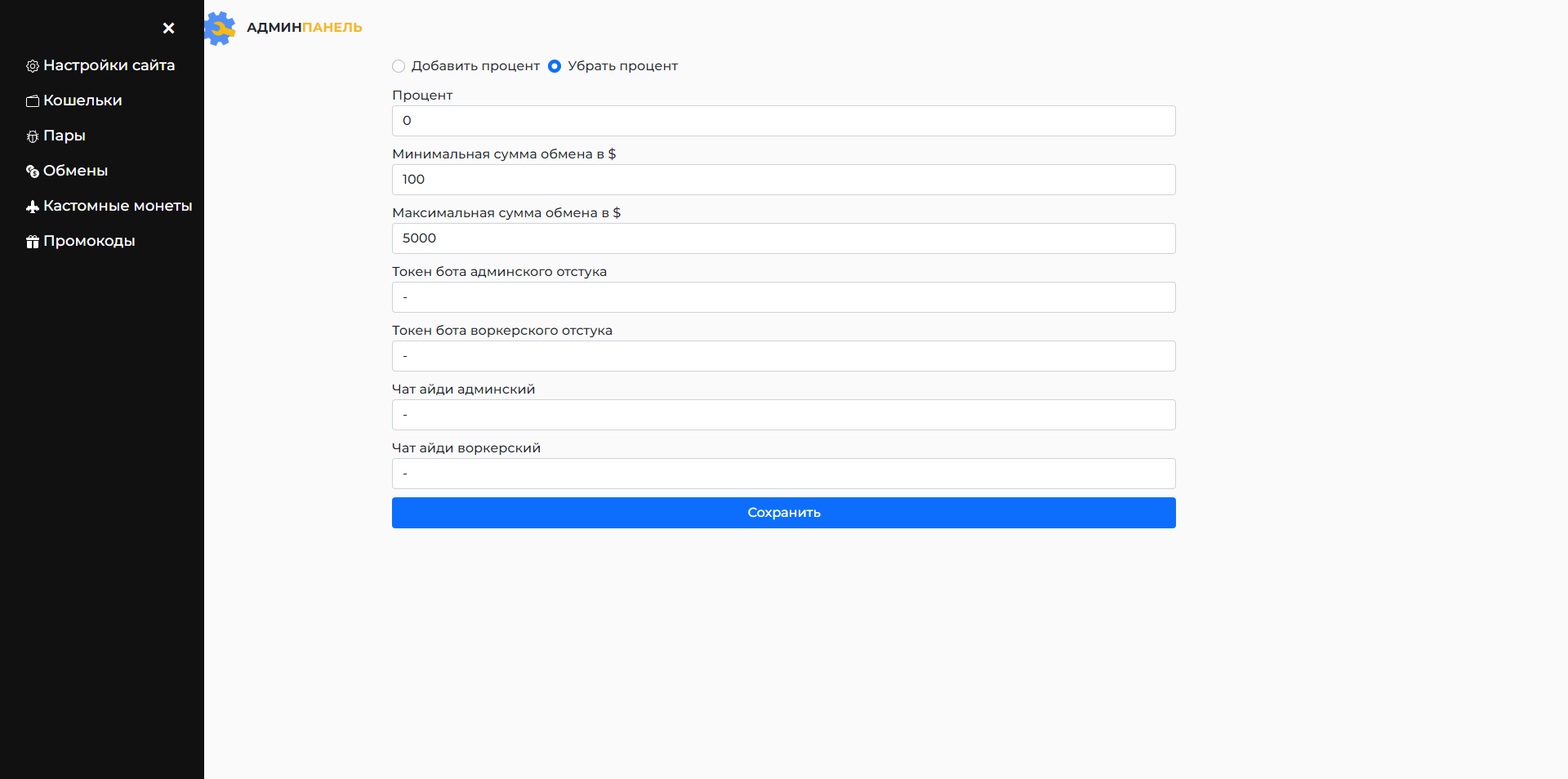 - Настройка Мин и Макс суммы обмена