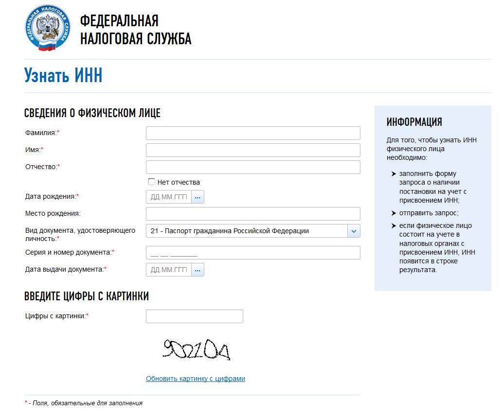 Идентификационный номер налогоплательщика (ИНН) — цифровой код, упорядочивающий учёт налогоплательщиков в Российской Федерации. Переходим на сайт (Узнать ИНН) Федеральной Налоговой Службы РФ. На странице видим внушительную по размерам форму, вводим все необходимые параметры (ФИО, Дата рождения, Информация для подтверждения личности) и нажимаем кнопку «Отправить запрос». Если все ввели правильно то получаем сообщение: «Ваш ИНН: xxxxxxxxxxxxxx»