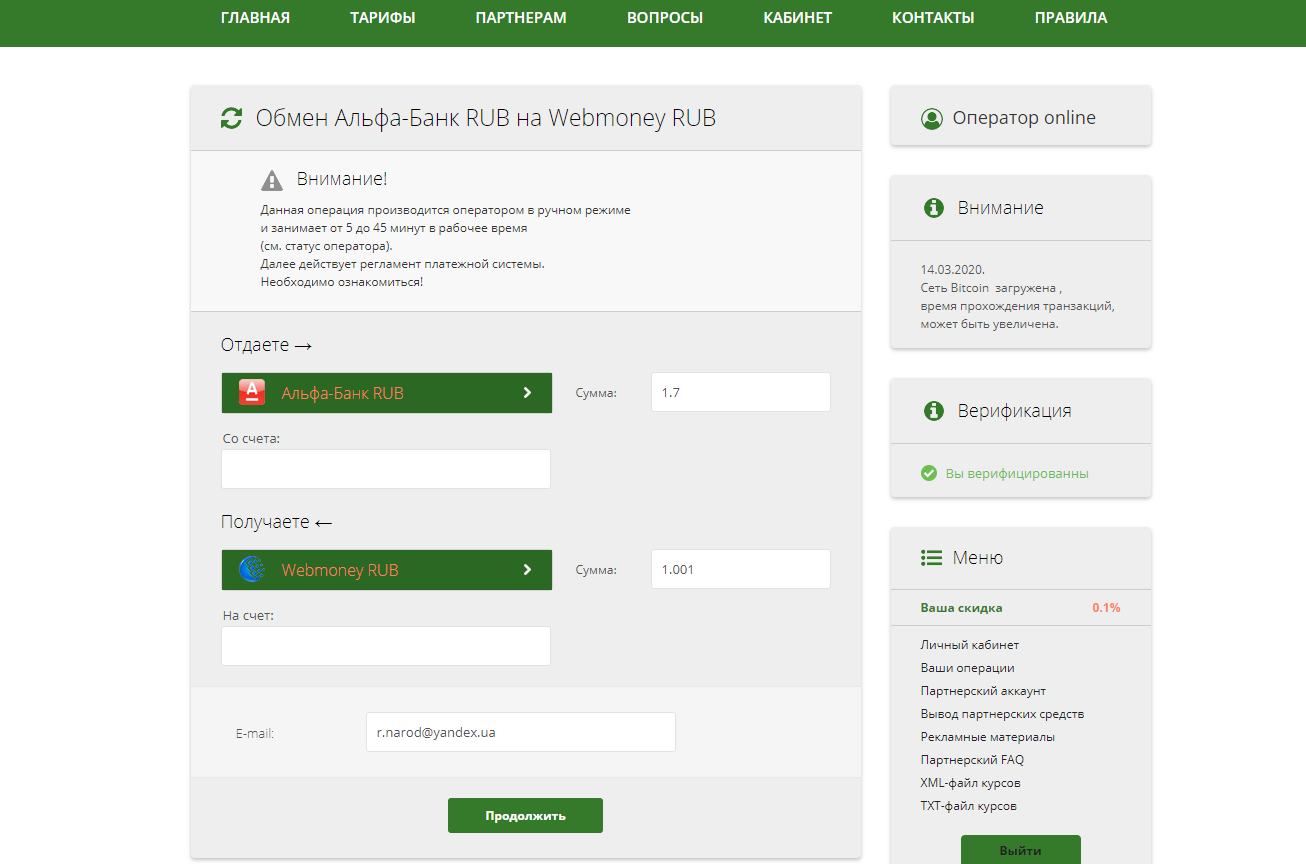 - Ручной с участием оператора. Процедура обмена: заявка на обмен → ручной перевод средства клиентом на указанные реквизиты → проверка оплаты оператором (админом) обменника → ручной перевод клиенту;
