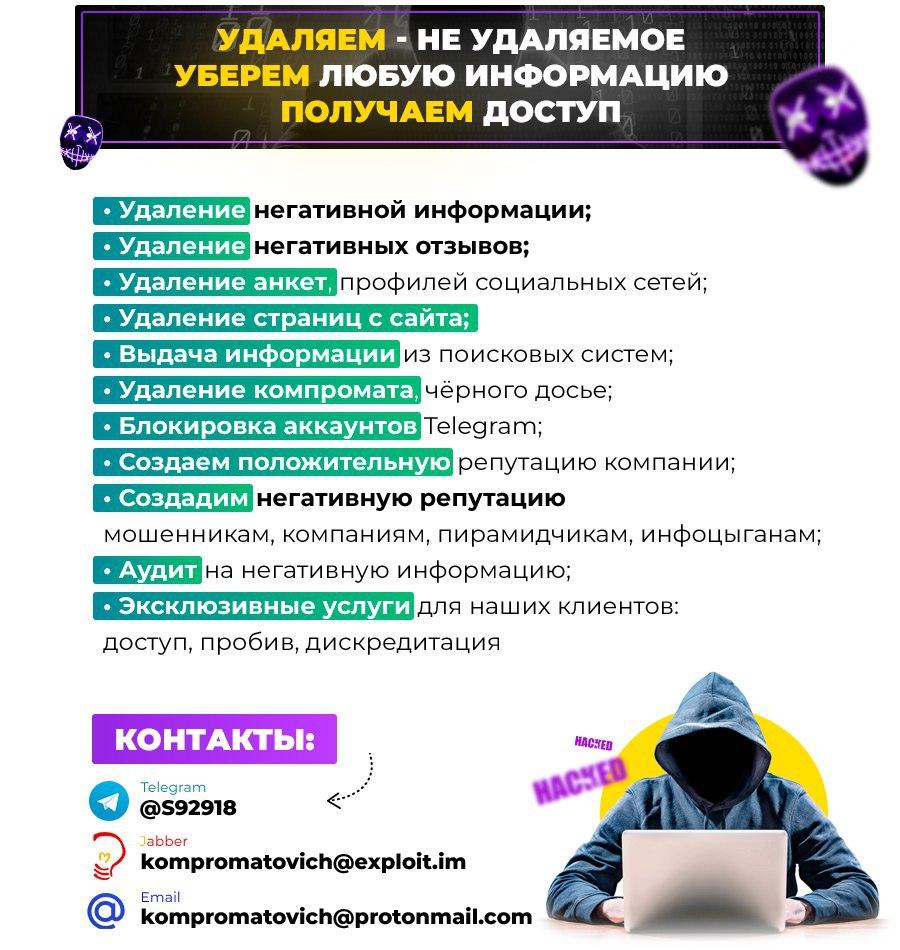 Сообщение в теме 'Удаление негативной информации, отзывов, анкет, страниц, каналов, выдачи поисковиков, компромата, управление репутацией, доступ!'. Жалобу на содержимое пользователя kompromatovich отправил(а) Gabriel. Причина жалобы: