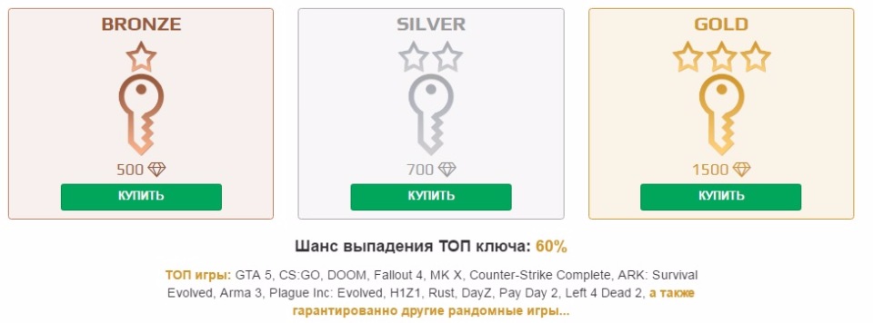 В магазине сайта,можно купить 3 ключа ( Бронза,Сильвер,Голд ) Там все ясно и понятно.
