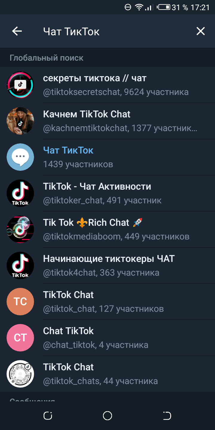 Один из примеров: Чаты в Telegram тематики TikTok —