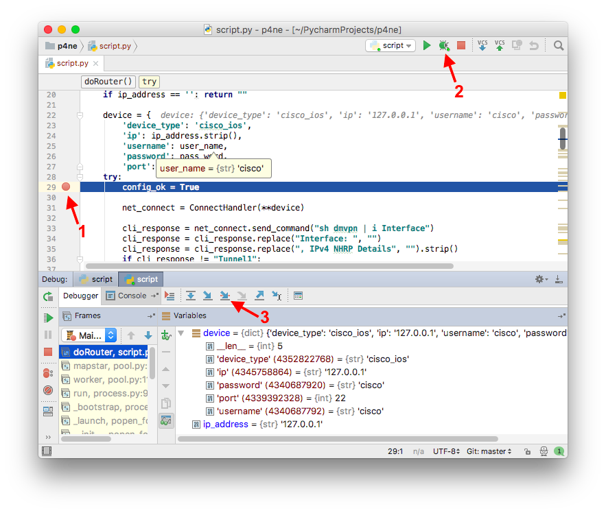 Пару слов о том, как отладить скрипт. Легче всего это делать в PyCharm. Отмечаем строчку, на которой хотим остановить выполнение скрипта, и запускаем выполнение в режиме отладки. После того, как скрипт остановится, можно будет посмотреть текущие значения всех переменных. Проверить, что передаются и принимаются корректные данные. Кнопками «Step Into» или «Step Into My Code» можно пошагово продолжить выполнение скрипта.