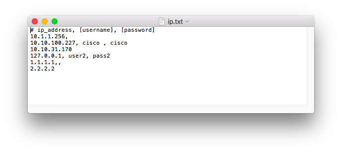 В качестве входных данных будем использовать текстовый файл “ip.txt”. В каждой строчке файла должен быть IP-адрес устройства, к которому мы подключаемся. Через запятую можно указать логин и пароль для конкретного устройства. Если этого не сделать, то будут использоваться те, которые вы введёте при запуске скрипта. Пробелы будут проигнорированы. Если первый символ в строке «#», то она считается комментарием и игнорируется. Вот пример корректного файла: