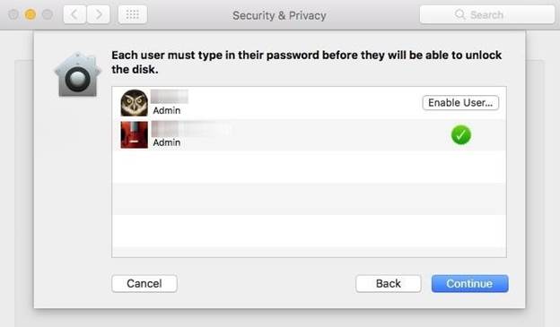 Если в системе есть другие пользователи, появится диалоговое окно, где можно выдать разрешение нужным пользователям. Для разблокировки диска соответствующий пользователь должен ввести свой пароль. Естественно, нужно разрешить разблокировку для административной учетной записи. Остальные пользователи - на ваше усмотрение. Далее опять нажмите на кнопку Continue.