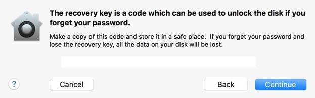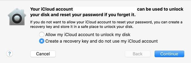 В зависимости от того, вошли ли вы через iCloud или нет (для версий Yosemite и выше), появится диалоговое окно с вопросом о том, хотите ли вы использовать учетную запись в iCloud или ключ восстановления для обнуления пароля в случае утери. Я предпочитаю хранить копию ключа в надежном месте, поскольку облако, по сути своей, является чьим-то компьютером. (Если вы не залогинились в iCloud, то сразу же увидите ключ восстановления).
