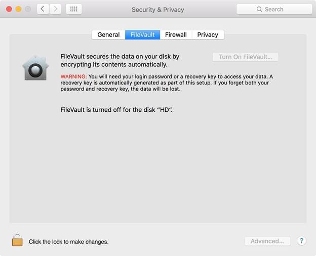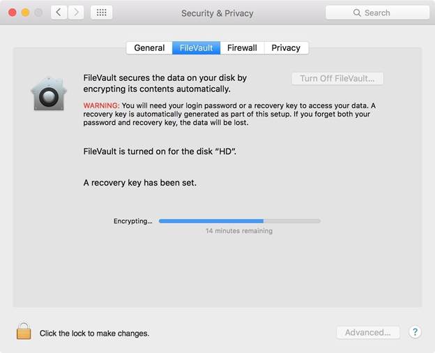 Мы будем использовать FileVault (средство, встроенное в ОС Mac), которое позволяет полностью зашифровать диск в 128-битном режиме XTS-AES. Эта схема шифрования рекомендуется Национальным институтом стандартов и технологий(NIST), совместима с Федеральным стандартом по обработке информациии пригодна к использованию в подотчетных отраслях, таких как правительство и медицина. То есть схема достаточно надежная.