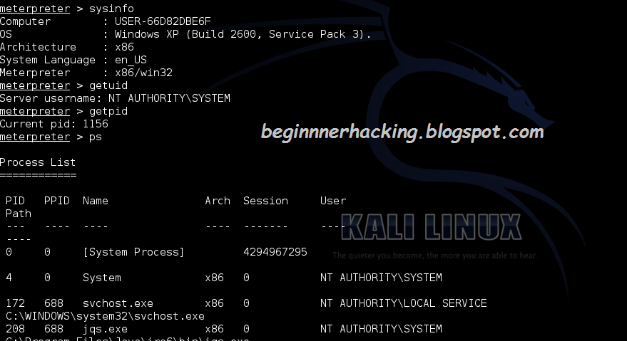 Теперь давайте воспользуемся базовой командой sysinfo, чтобы получить информацию о системе, к которой мы только что получили доступ. Кроме этого, выполните getuid, чтобы узнать, от имени какого пользователя вы зашли в систему и какими привилегиями обладаете. Вдобавок, getpid покажет вам, какой процесс использует ваша начинка, а ps продемонстрирует список всех процессов, запущенных в системе жертвы.