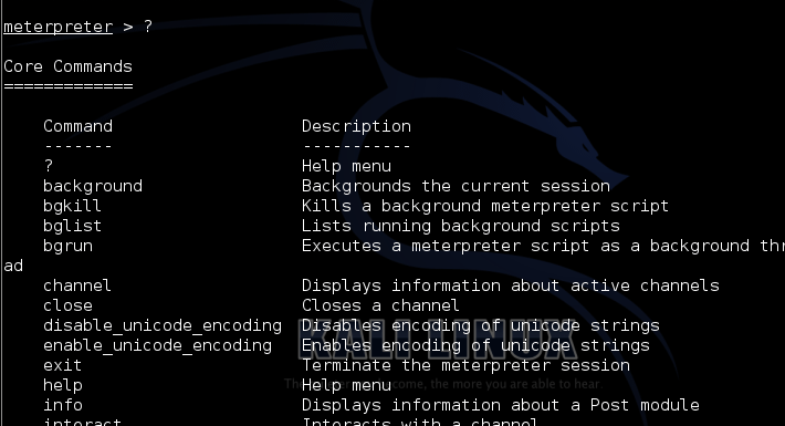 Чтобы посмотреть список опций, предоставляемых meterpreter, введите ?.