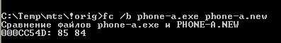 Теперь, наверное, понятен и формат CRK-файла на первом листинге. Единственный изменённый нами байт имеет 16-ричный адрес 000CC54D и мы просто записали, какой байт на какой заменить. Тот же результат можно получить, сравнив оригинальный и изменённый файлы phone-a.exe консольной командой Windows fc /b (бинарное сравнение файлов):