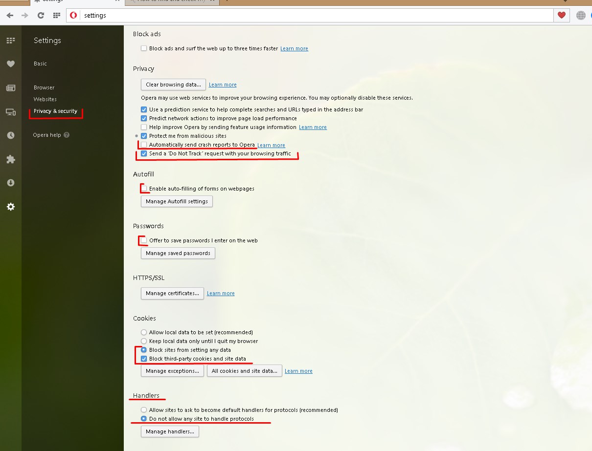 В "Privacy & Security" мы отключаем доступ к протоколам, куки и анонимную отправку отчетов в Оперу. Важно поставить галочку напротив пункта "Send a ‘Do Not Track’ request with your browsing traffic", чтобы отключить систему "жучков", собирающую информацию о вас и ваших предпочтениях.