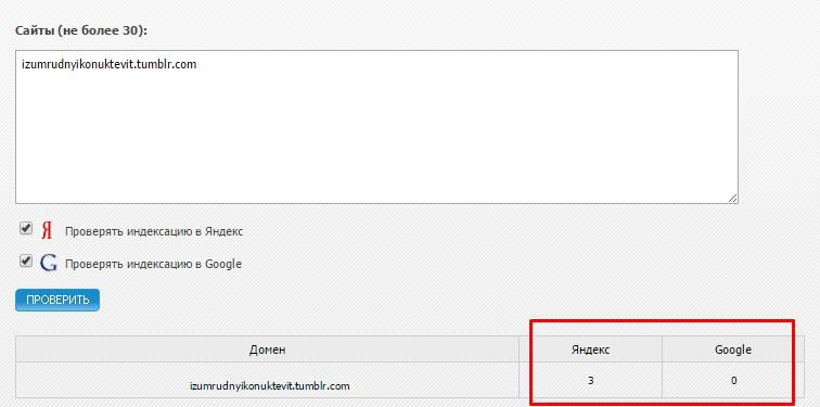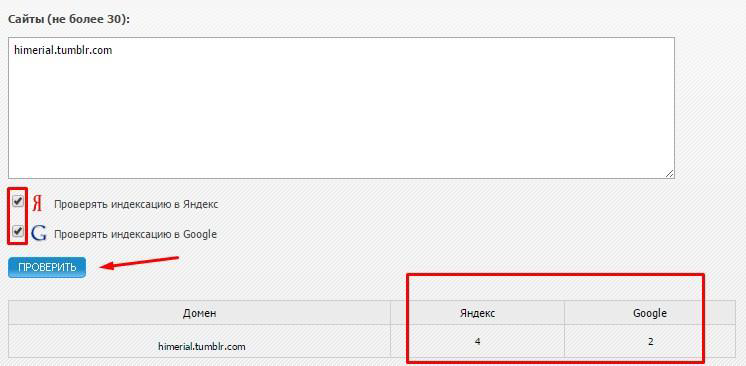 Сюда можно вбить одновременно до 30 адресов сайтов для проверки и получить информацию о том, сколько страниц данного сайта уже находятся в индексе.