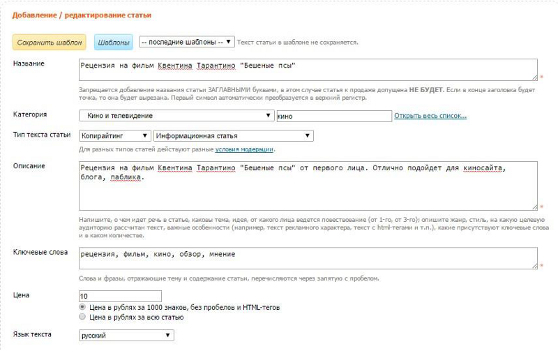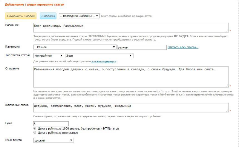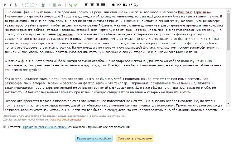 Немного корректируем статью, как и в прошлый раз. И отправляемся размещать ее на биржу.