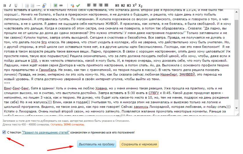 После того, как баланс пополнился, возвращаетесь на страницу с добавлением текста и снова нажимаете кнопку Выставить на продажу.