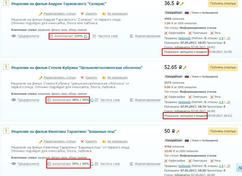 Берем следующую статью из того же блога, обрабатываем и получаем довольно объемный текст с уникальностью 97%. Отличный результат! Затрачено минимум времени, выставлены сразу 2 статьи-рецензии на сумму более 100 рублей!