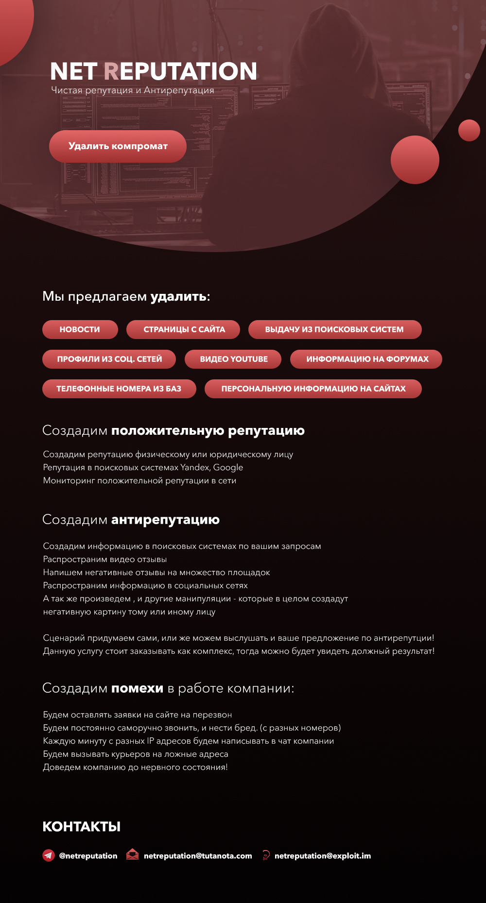 Сообщение в теме 'Взлом, предлагаем удаление страниц, негативной информации, видео YouTube, компромата, негативных новостей!'. Жалобу на содержимое пользователя Netreputation отправил(а) Moriarty. Причина жалобы: