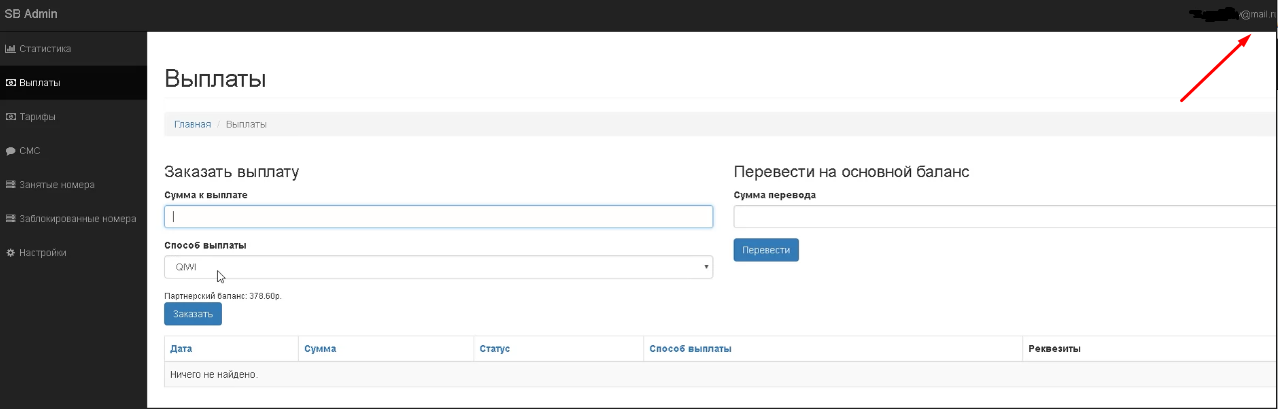 Далее переходим в раздел выплаты. Здесь указываем сумму, на какой кошелек выводить или перевести на основной баланс (красной стрелкой указано где вы можете мосмотреть свой основной баланс). Его можно тратить на покупку номеров.