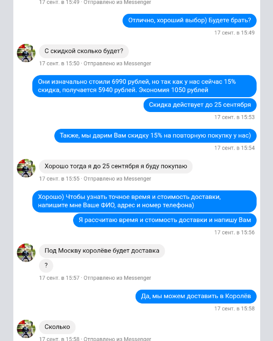- Курс по таргету в Инсте и Фейсбуке, сам курс стоил 6499, когда я его покупал. Посмотрел его, в тот же день настроил таргет и получил первую заявку, на 5940 руб. (2к чистая прибыль с неё) Это был мой первый запуск, поэтому стоимость заявки обошлась мне в 150 рублей. Кстати, я всё ещё не закрыл этого клиента, так как попросту забил на него. В магазе проходит акция и до 25-го сентября скидки 15%. Так вот, его цена очень обрадовала и он был готов купить. Нужно только дожать. Но он не читает сообщения, последние 2 дня.