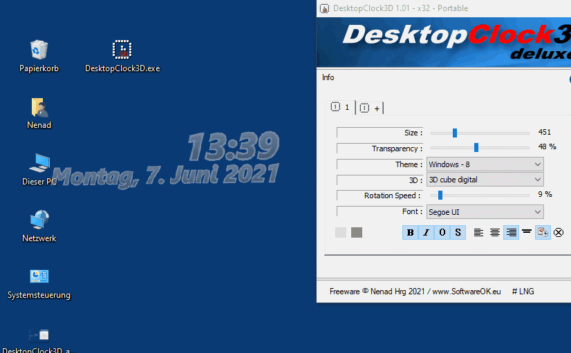 Создано по просьбе нескольких пользователей для настольных 3D-часов для Windows 10, 8.1,..., которые отображаются в 3D на рабочем столе. Поэтому я много работал и реализовал эти настольные 3D-часы для всех операционных систем Windows, не только для настольных ПК, но и для планшетных ПК и, например, MS Surface Pro/GO.