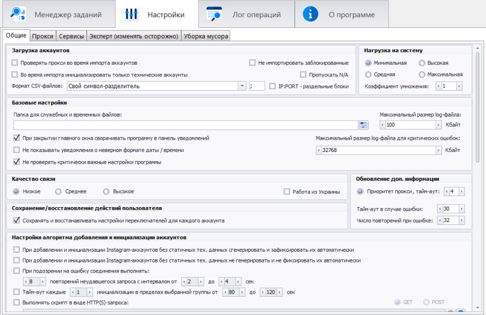 - Нет программных ограничений на число одновременно работающих aккаунтов (проверено одновременное продвижение более 1000 aккаунтов).